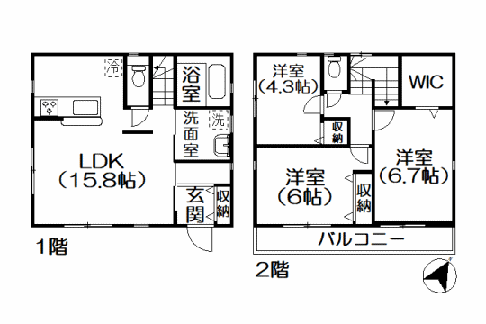 2026年2月中旬完成予定、2号棟のご紹介です。1台停められる駐車場が付いた3LDKの間取り。南向きで陽当たり良好です。キッチンはご家族とコミュニケーションが取りやすい対面式で明るく開放的。2階の6.7帖の洋室にはWICがあり、季節物の収納などにも重宝しそうです。駅やスーパー、コンビニなどが徒歩圏内に揃う生活便利な環境です。